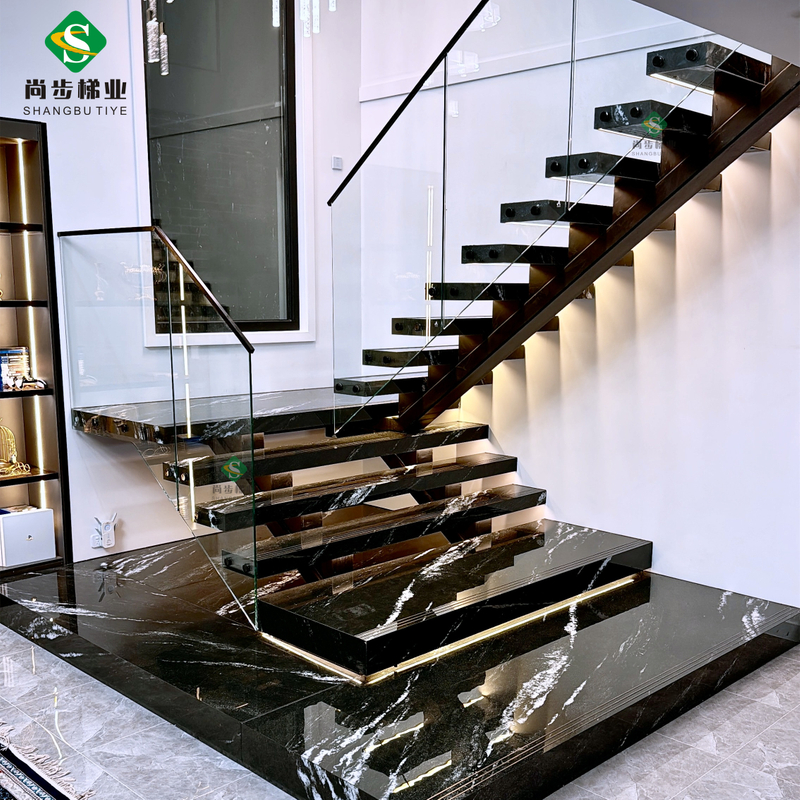 厂家定制生产岩板大理石踏板别墅发光楼梯12mm钢化玻璃护栏